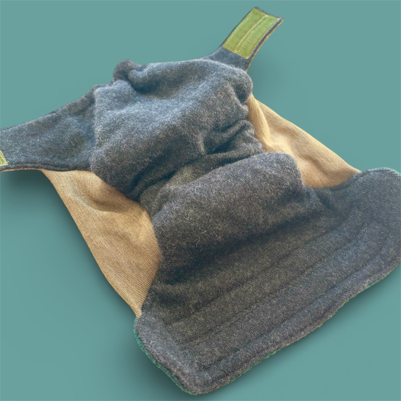 Diese WollfairWindel wird mit Klettverschluss um den Bauch geschlossen.